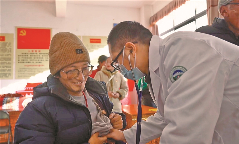 圖為援藏醫(yī)療專家為群眾聽(tīng)診。 記者 萬(wàn)靖 攝