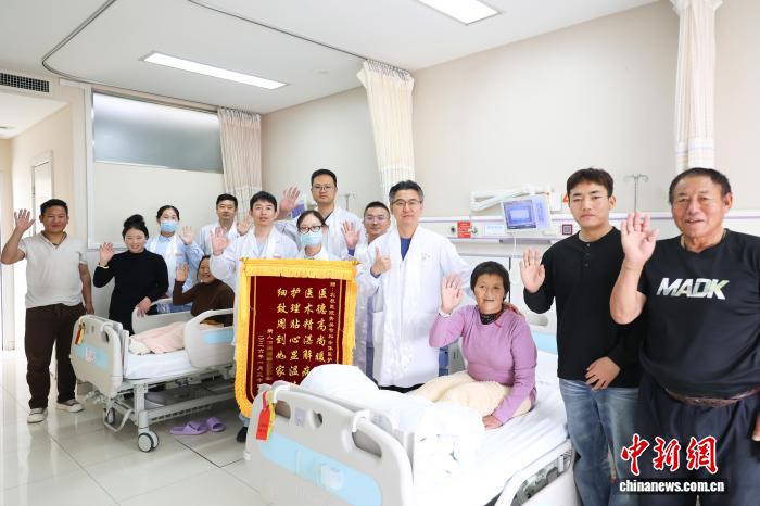 64歲的姐姐次仁忠嘎和56歲的妹妹丁增,在南開(kāi)大學(xué)附屬北辰醫(yī)院骨關(guān)節(jié)科接受了機(jī)器人輔助下雙側(cè)全膝關(guān)節(jié)表面置換術(shù),術(shù)后家屬為該院醫(yī)護(hù)團(tuán)隊(duì)獻(xiàn)上哈達(dá)及錦旗。(南開(kāi)大學(xué)附屬北辰醫(yī)院供圖)