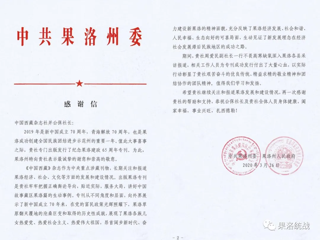 中國(guó)西藏網(wǎng)訊 3月26日,中共果洛州委、州人民政府致信中國(guó)西藏信息中心,對(duì)中國(guó)西藏信息中心推出果洛藏族自治州建政65年《中國(guó)西藏》雜志專刊表示感謝。