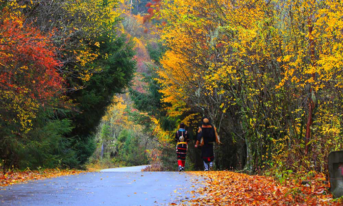 穿著民族服裝的情侶漫步在國(guó)道318之上,與秋日景色融成了一幅畫(huà)。