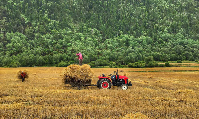 秋天是收獲的季節(jié),農(nóng)牧民把收獲的青稞秸稈裝上拖拉機(jī)。