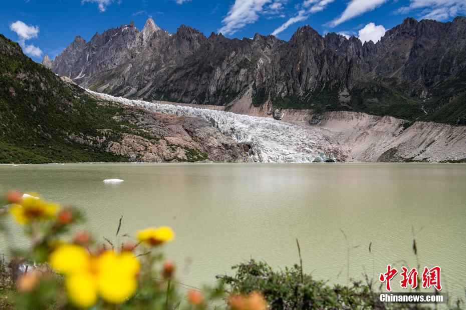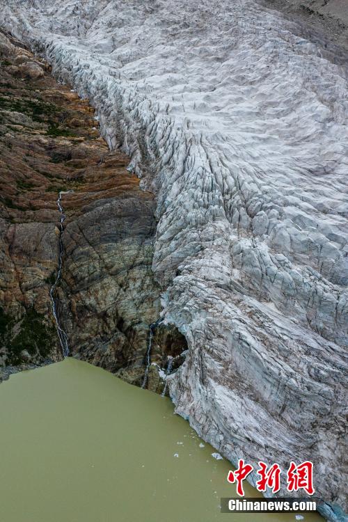 約雄冰川位于西藏自治區(qū)那曲市巴青縣境內,從空中俯瞰,巨大的冰川宛若一條巨龍,從6328米高的布加雪山峰頂傾瀉奔下,形成懸冰川體,蔚為壯觀。圖為約雄冰川融水形成的約雄措。 何蓬磊 攝