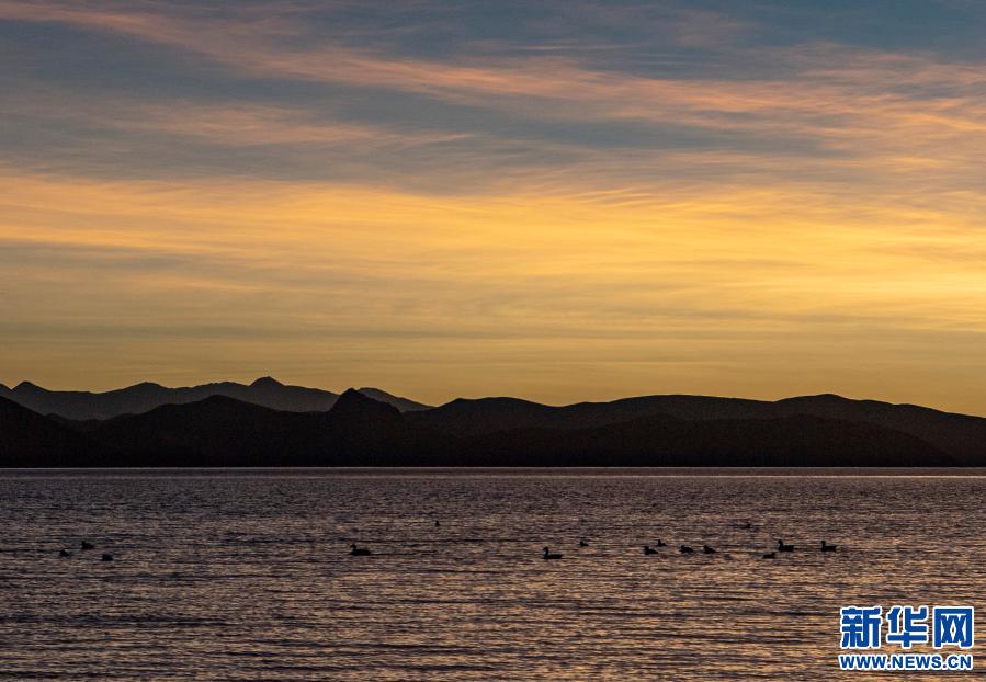 日落時(shí)分,水鳥在羊卓雍錯(cuò)湖面上游曳(1月9日攝)。新華社記者 孫非 攝