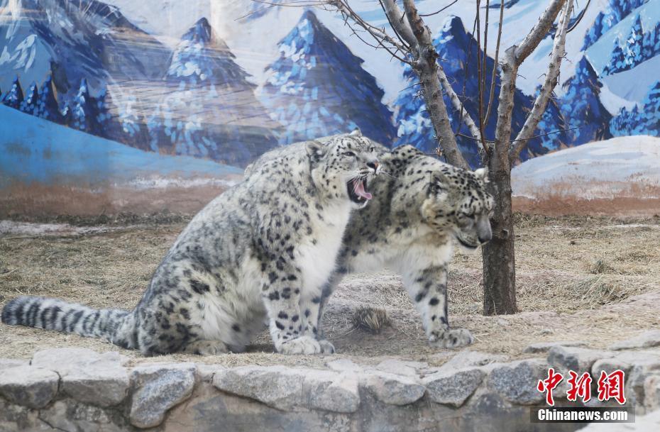 3月13日,青藏高原野生動(dòng)物園雪豹館內(nèi),“傲雪”(左)陪伴21歲的“大豹”(右)享受春日暖陽(yáng)。副園長(zhǎng)齊新章介紹,為了雪豹的身心健康,2017年,動(dòng)物園嘗試以科學(xué)、理性的技術(shù)將年幼的雌性“傲雪”和年老的雄性“大豹”合籠飼養(yǎng),發(fā)現(xiàn)“大豹”在“傲雪”的陪伴和帶動(dòng)下,活動(dòng)量明顯增加。據(jù)悉,2000年出生的“大豹”今年已21歲(相當(dāng)于人類105歲),突破雪豹的壽命極限值,且身體各項(xiàng)指標(biāo)穩(wěn)定。中新社記者 馬銘言 攝