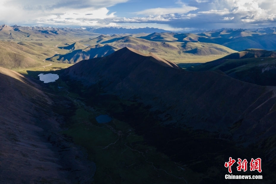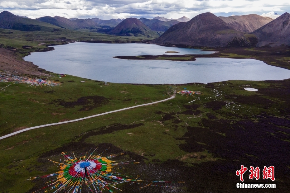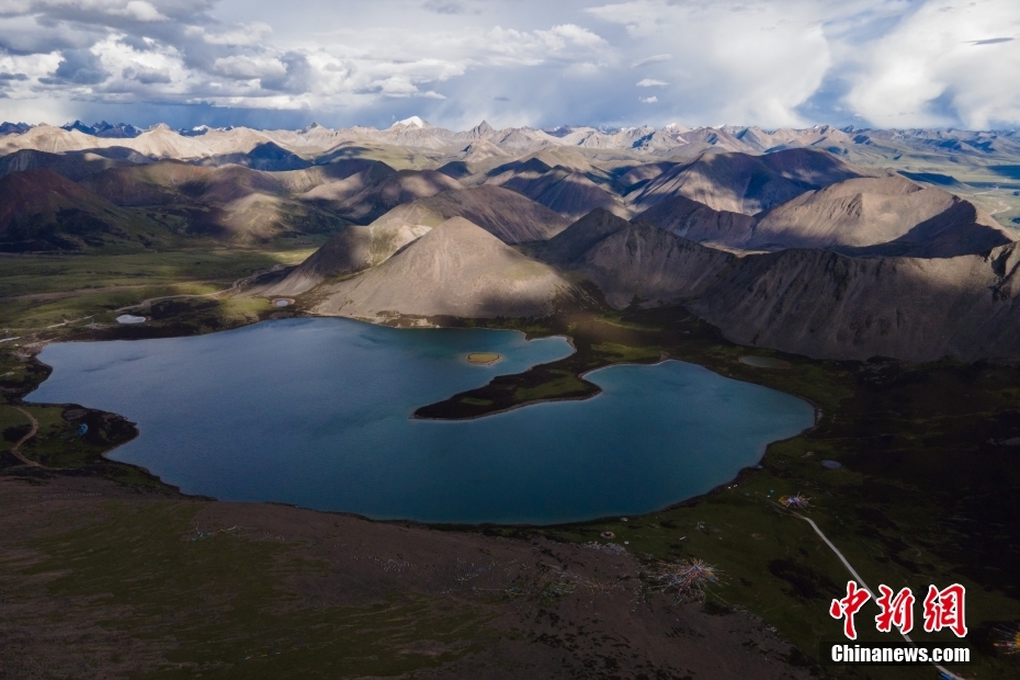 6月23日,思金拉措湖邊高原山脈風光。思金拉措位于西藏墨竹工卡縣日多鄉(xiāng),海拔4500多米,周邊群峰簇擁,地形猶如聚寶盤,不少民眾將其稱為西藏的“財神湖”。(無人機照片) 中新社記者 江飛波 攝