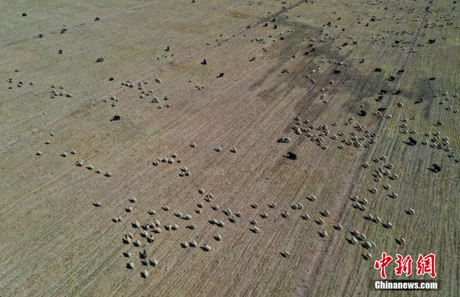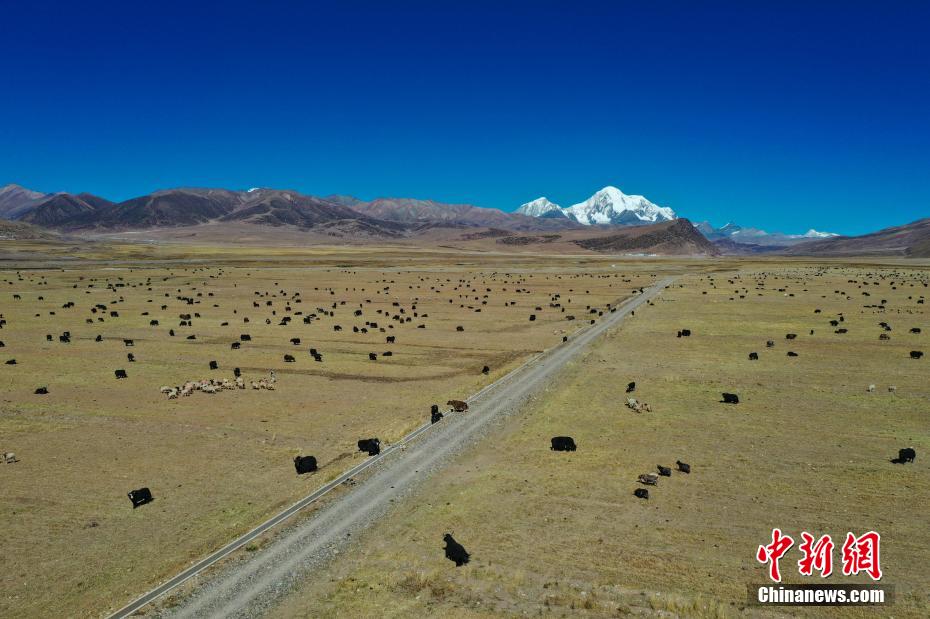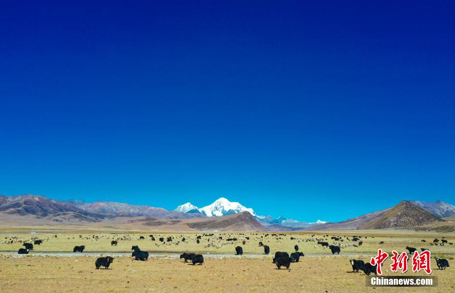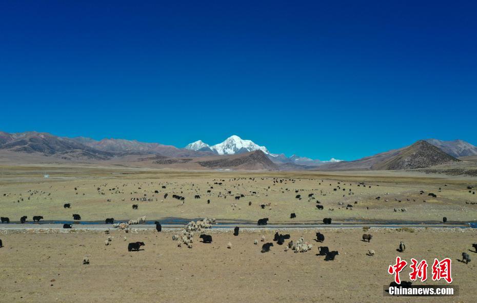 圖為瓊穆崗嘎雪山腳下成群結(jié)隊的牛羊。(無人機(jī)照片) 貢嘎來松 攝