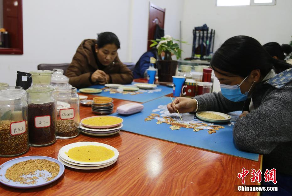 12月8日,青海省黃南藏族自治州尖扎縣,藏族婦女們用五谷作畫(huà),秀指尖技藝。青稞、小麥、各式油菜籽等農(nóng)作物經(jīng)挑選、排列組合,“變身”精美的“尖扎五谷畫(huà)”。 中新社記者 馬銘言 攝