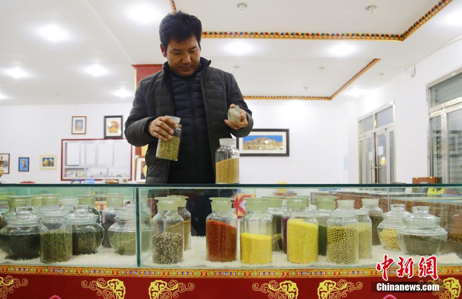 12月8日,青海省黃南藏族自治州尖扎縣,五谷畫(huà)藝人索南本查看農(nóng)作物儲(chǔ)存狀況。青稞、小麥、各式油菜籽等農(nóng)作物經(jīng)挑選、排列組合,“變身”精美的“尖扎五谷畫(huà)”。2007年,該縣藝人索南本開(kāi)始創(chuàng)作藏式風(fēng)格五谷畫(huà),摸索防臭、防蟲(chóng)、防潮、裝裱等步驟,并在當(dāng)?shù)亻_(kāi)展培訓(xùn),帶領(lǐng)殘疾、困難民眾進(jìn)行創(chuàng)作,憑雙手致富。 中新社記者 馬銘言 攝