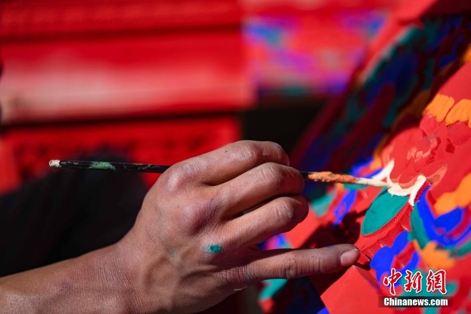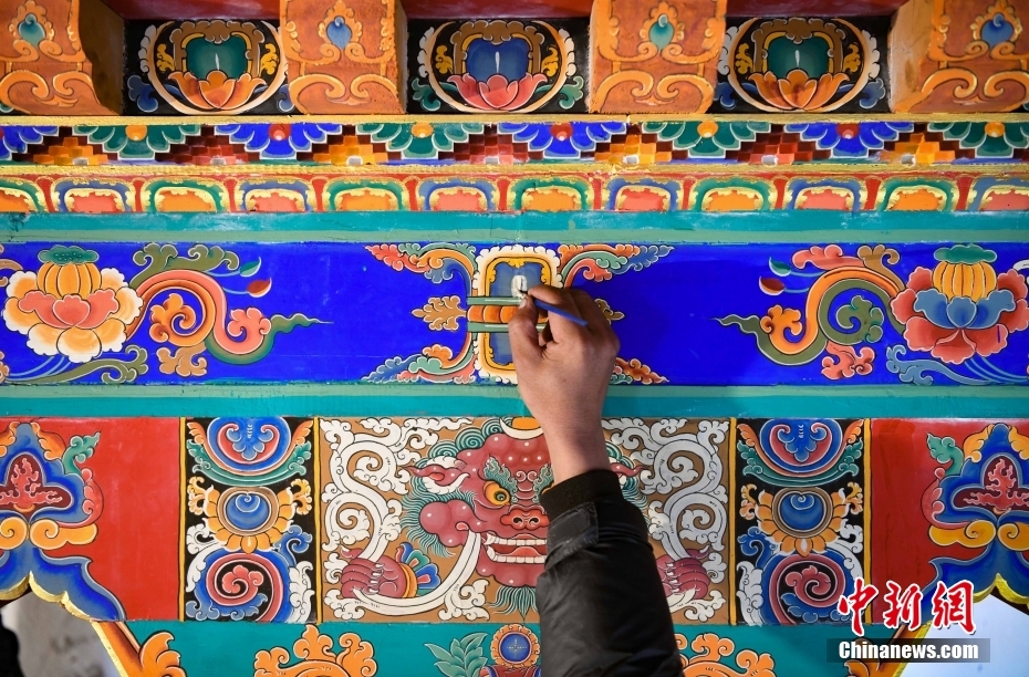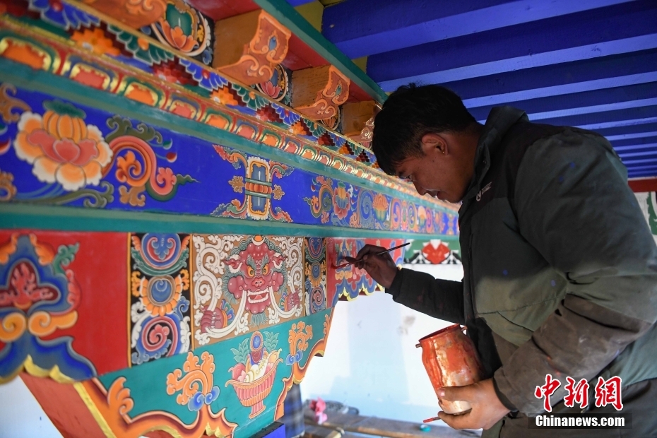 12月28日,西藏拉薩堆龍德慶區(qū),古俗民族傳統(tǒng)手工藝發(fā)展專(zhuān)業(yè)合作社員工在房屋上繪制藏式裝飾。據(jù)悉,該合作社以繪畫(huà)、木工、縫紉為主,承接傳統(tǒng)手工藝方式制作家具、房子裝修、唐卡繪畫(huà)、旅游產(chǎn)品、文物建筑維修等工作。自2018年合作社成立至今,帶動(dòng)就業(yè)共60余人。 中新社記者 貢嘎來(lái)松 攝