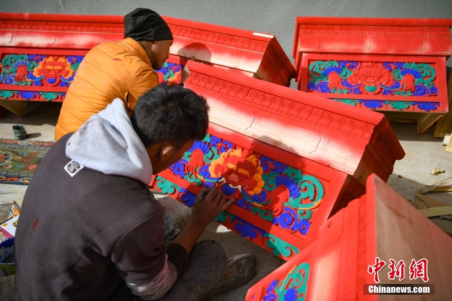 12月28日,西藏拉薩堆龍德慶區(qū),古俗民族傳統(tǒng)手工藝發(fā)展專(zhuān)業(yè)合作社員工在家具上繪制藏式裝飾。中新社記者 貢嘎來(lái)松 攝