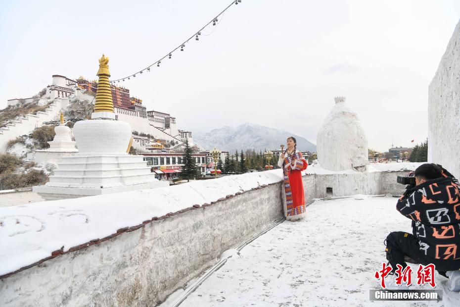 2月21日,游客穿著藏族傳統(tǒng)服飾在布達(dá)拉宮拍照留念。當(dāng)日,西藏拉薩市迎來降雪,雪后的拉薩城區(qū)和周圍群山白雪皚皚,風(fēng)景如畫。 中新社記者 貢嘎來松 攝