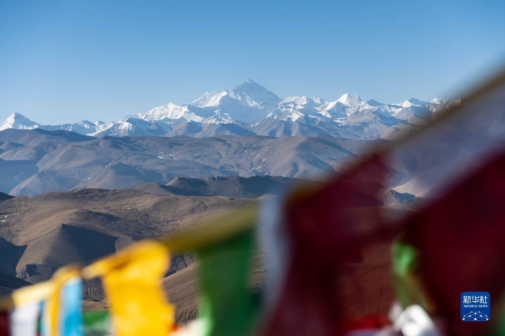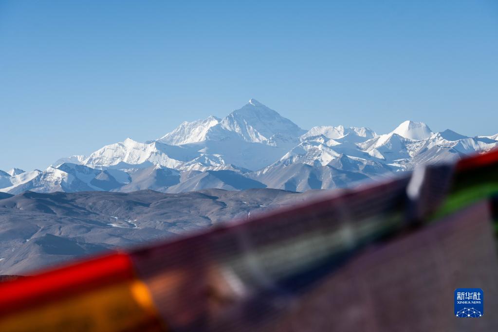 這是3月15日在西藏日喀則透過(guò)藍(lán)色經(jīng)幡拍攝的珠穆朗瑪峰。新華社記者 周荻瀟 攝