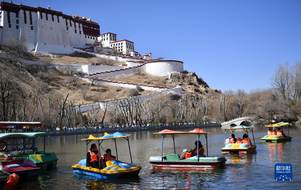 3月20日,在布達(dá)拉宮腳下的龍王潭公園內(nèi),游客乘船游玩。新華社記者 覺果 攝