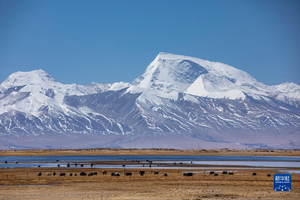 4月22日,牦牛在西藏阿里地區(qū)普蘭縣境內(nèi)納木那尼峰山腳下活動。新華社發(fā)(劉曉東攝)