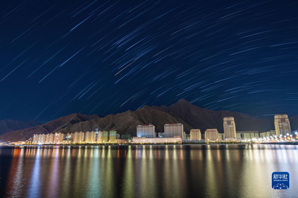 西藏拉薩市夜晚星空璀璨,清澄的天空與城市燈光相得益彰。
