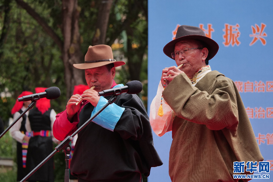6月11日,鷹笛藝術(shù)自治區(qū)級(jí)代表性傳承人次旦和多吉在演奏《金剛山崖上的雄鷹》。新華網(wǎng) 旦增努布攝