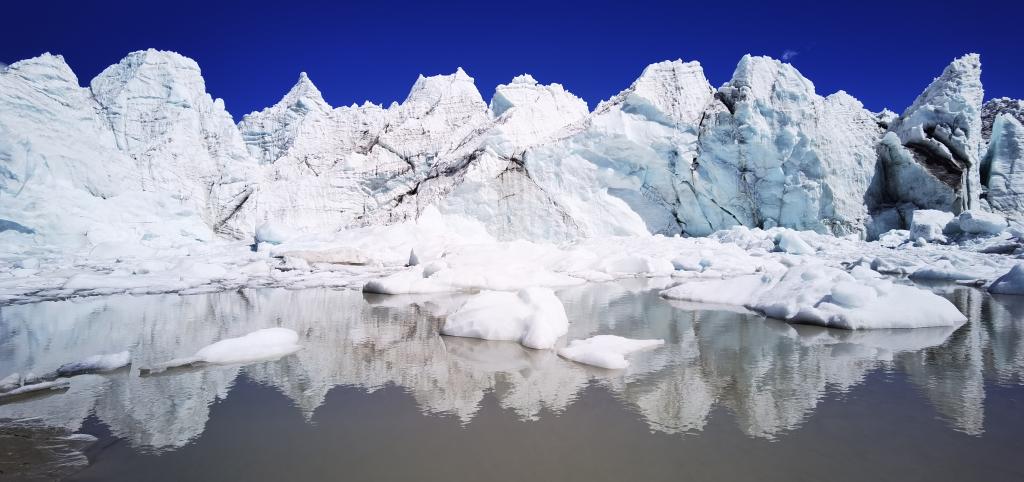 這是位于山南市浪卡子縣的措嘉冰川,冰川融水形成河流(6月4日攝,無人機(jī)照片)。新華社記者 沈虹冰 攝