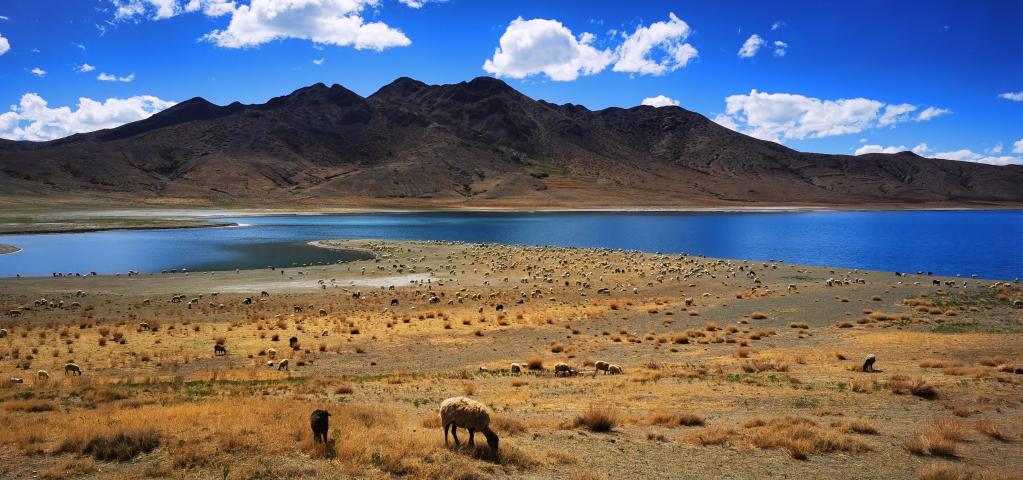 牲畜在羊卓雍措湖邊吃草(6月3日攝)。新華社記者 沈虹冰 攝