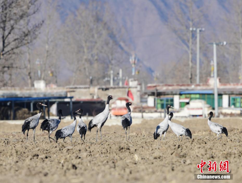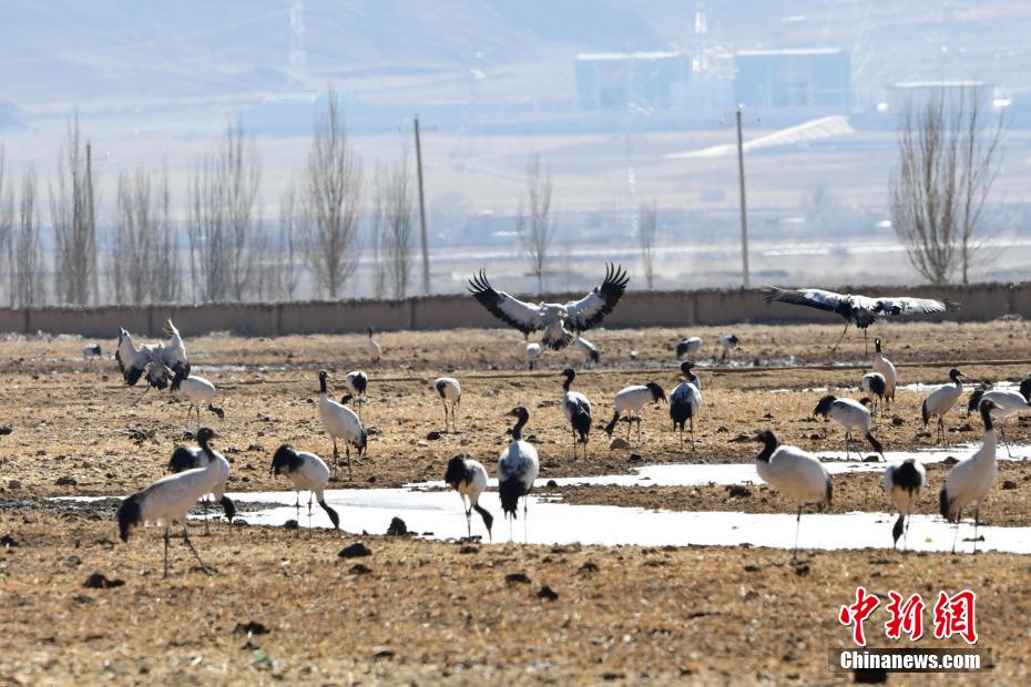 每年的10月底,成群的黑頸鶴飛到西藏拉薩市林周縣越冬,在拉薩市林周縣周邊的湖泊濕地度過5個月的“閑云野鶴”生活,次年三四月份再飛向藏北草原繁殖。黑頸鶴是世界上唯一一種高原鶴類。具有足長、喙長、頸長的典型涉禽類特征,適合在沼澤地里行走。黑頸鶴的頸、尾為黑色,體羽為灰白色。黑頸鶴是國家一級保護動物。目前,每年到林周縣越冬的黑頸鶴已達2000只左右。圖為黑頸鶴在林周境內的農田里覓食、嬉戲。 貢嘎來松 攝
