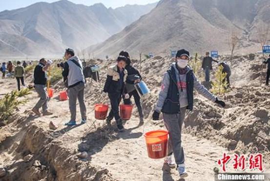 圖為西藏拉薩曲水縣才納鄉(xiāng)四季吉祥村義務(wù)植樹(shù)點(diǎn)志愿者們忙著提水 何蓬磊 攝