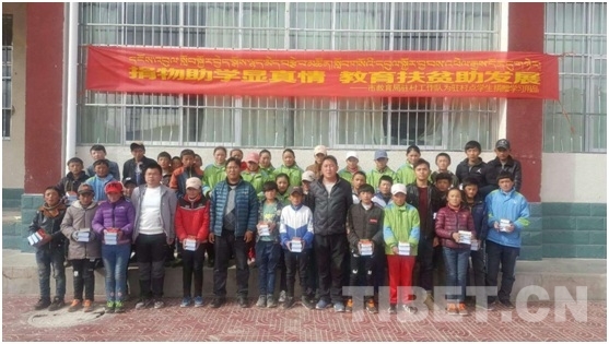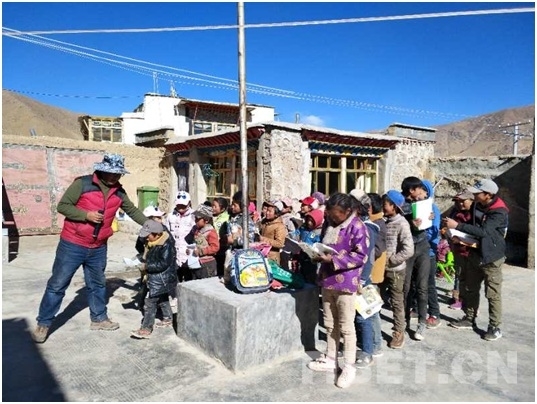 駐村隊(duì)長(zhǎng)次仁扎西向孩子們發(fā)放學(xué)習(xí)用品