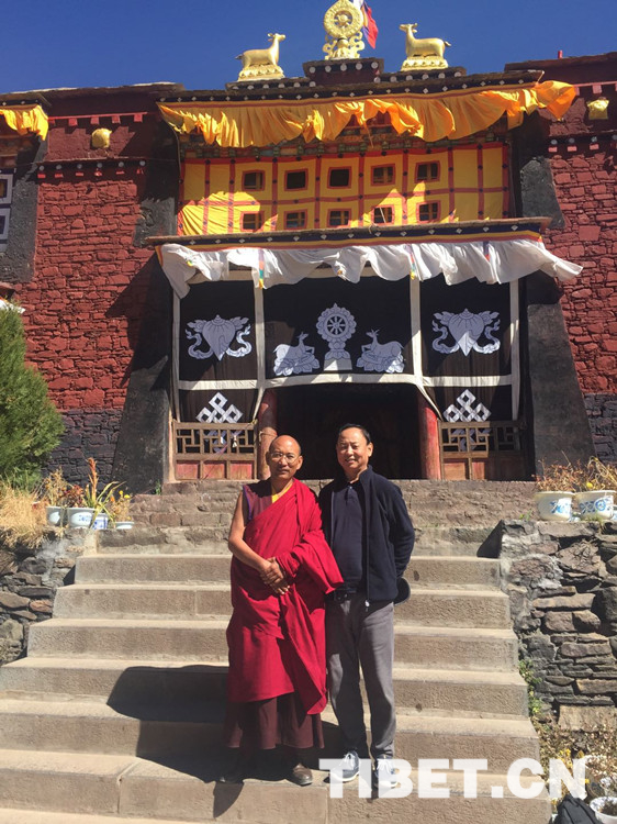 圖為豆格才讓(右一)在藏區(qū)調(diào)研時與僧人合影