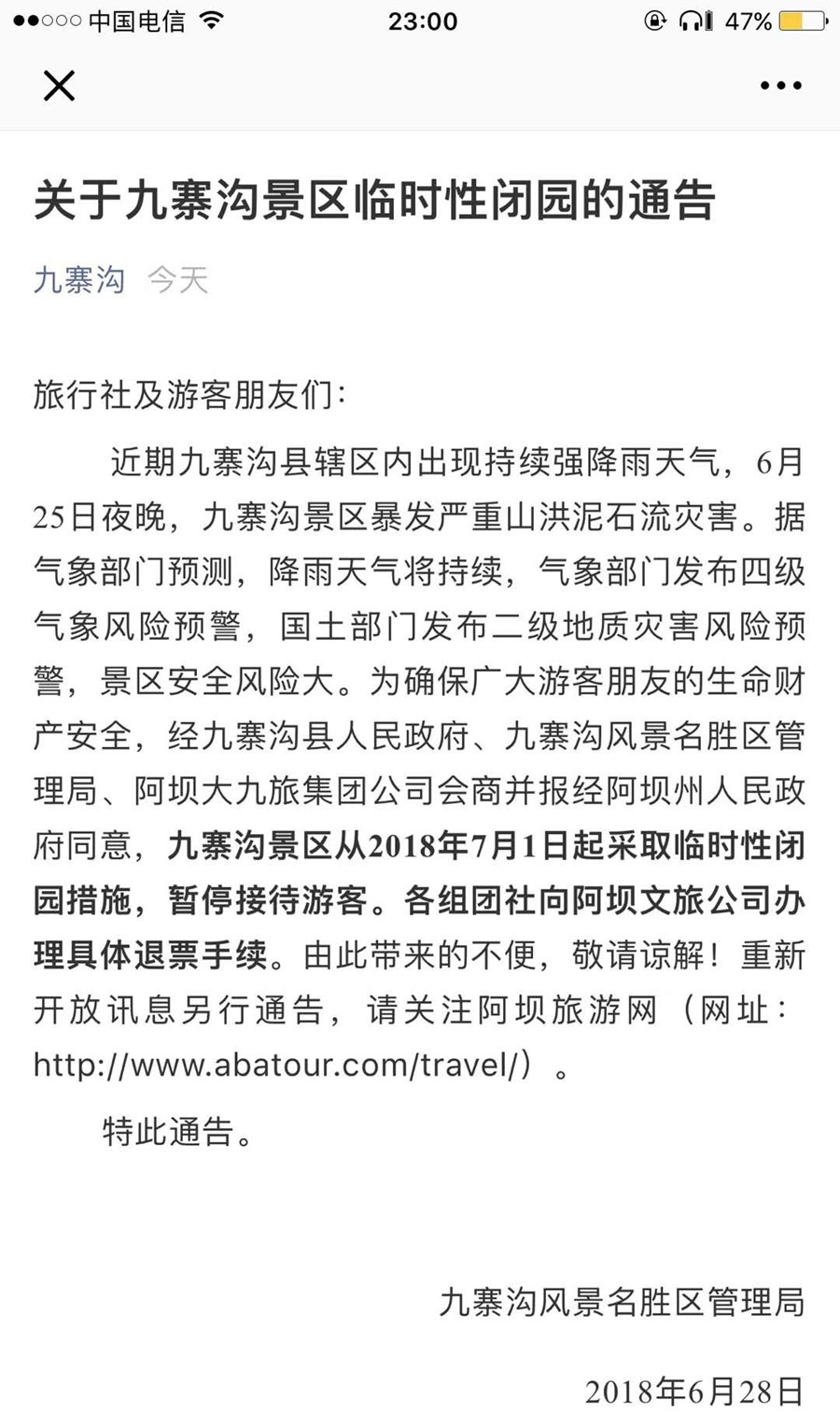 圖為九寨溝官方微信發(fā)布的通告截圖。