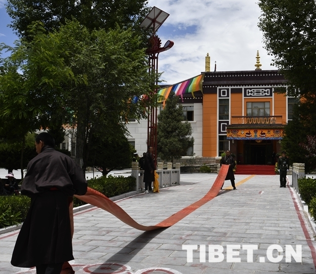 在位于拉薩市區(qū)的班禪行宮雪林多吉頗章大院內(nèi),一場更加熱烈的儀式也即將進(jìn)行。在雪林多吉頗章主殿前,僧人們提前繪制了金剛結(jié)等吉祥圖案,一條尺許寬的地毯從歡迎隊(duì)伍處一直延伸到主殿門前。來自拉薩各大寺廟的僧眾代表和拉薩信教群眾代表,帶著虔誠和喜悅的心情,翹首以盼十一世班禪的到來。