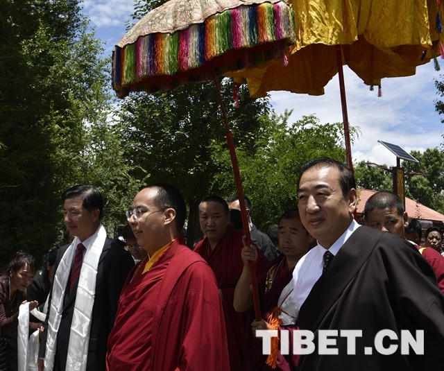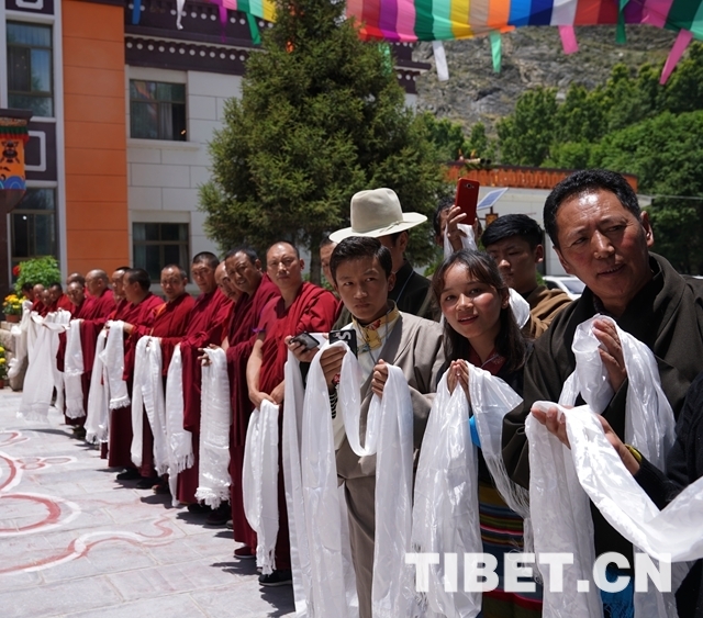 當(dāng)大院內(nèi)響起法號聲時,早已在此等候的僧俗信教群眾紛紛翹首踮足,盼望一睹十一世班禪的風(fēng)采。十一世班禪剛下車,高僧們手持香爐,打著幡幛、華蓋,吹奏佛樂,以藏傳佛教最隆重的禮儀迎接班禪額爾德尼?確吉杰布的到來。身著藏族傳統(tǒng)盛裝的男女青年,向十一世班禪敬獻(xiàn)象征吉祥如意的“切瑪”,表達(dá)拉薩各族各界人士和僧俗信教群眾的美好祝愿。在此等候的自治區(qū)有關(guān)領(lǐng)導(dǎo)也與十一世班禪互敬哈達(dá)、互致問候。