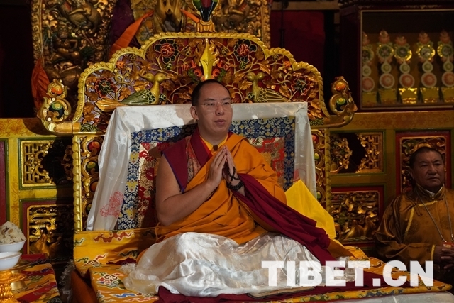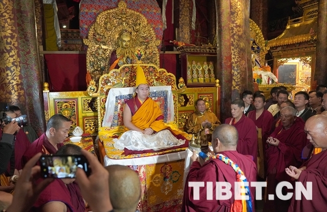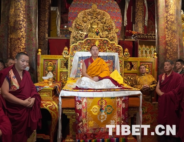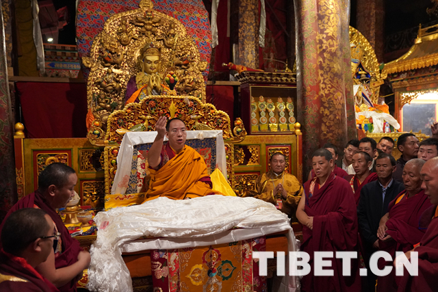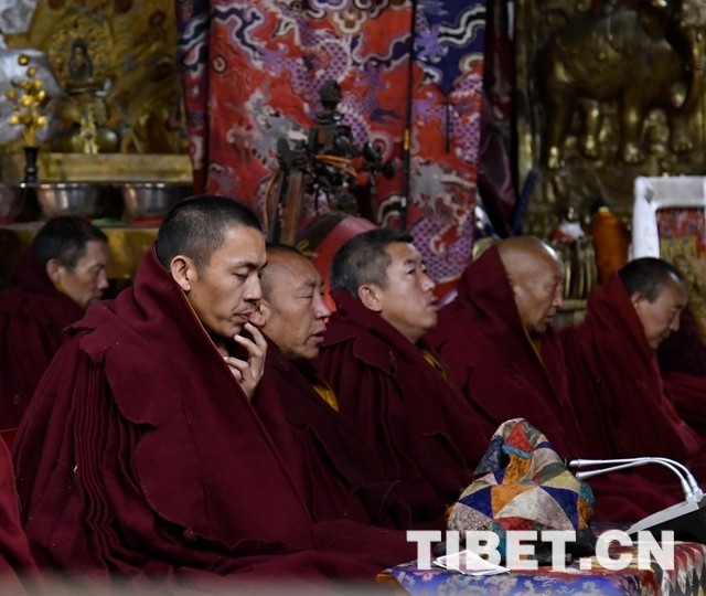 朝拜結束后,十一世班禪登上設在釋迦牟尼佛像正對面的寶座上,面朝佛像,帶領眾僧念誦經(jīng)文,祈愿五谷豐登、國泰民安、世界和平。