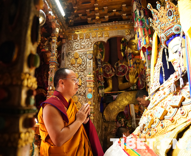 十一世班禪來到釋迦牟尼佛像前,虔誠而莊重地向釋迦牟尼十二歲等身佛像叩頭朝拜,并念誦經(jīng)文。隨后,十一世班禪手持哈達徐徐走到釋迦牟尼佛像前,雙手合十祈福,向佛像敬獻哈達,并為佛像面部涂繪金粉。