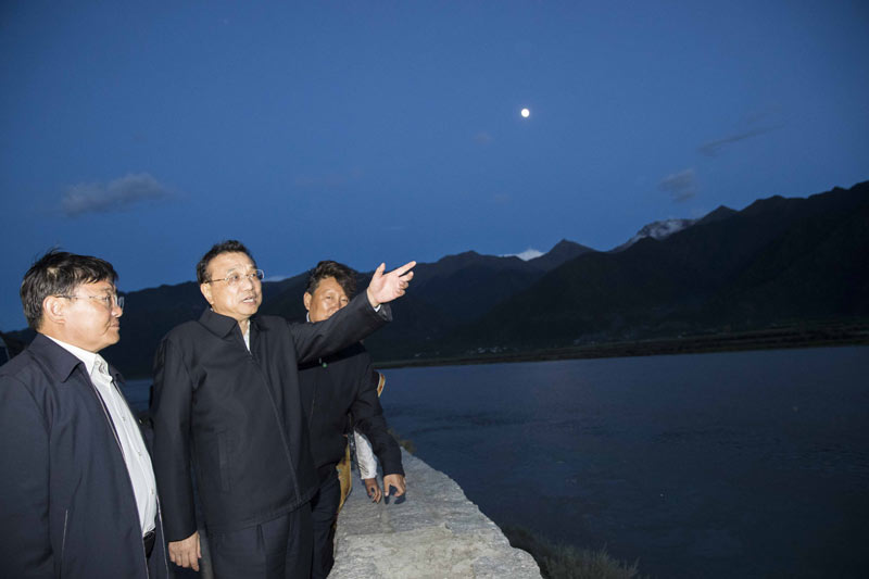 7月25日傍晚,李克強(qiáng)總理來到雅魯藏布江與尼洋河交匯處,考察水資源和生態(tài)保護(hù)情況。來源:中國(guó)政府網(wǎng)