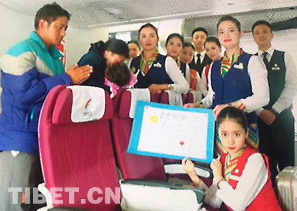 圖為2017年4月30日,TV9815從拉薩到北京執(zhí)飛途中,格?;ò嘟M護(hù)送因燒傷急需赴京救治的1歲零7個(gè)月的貢布次旦一家,并為其募款。藏航供圖