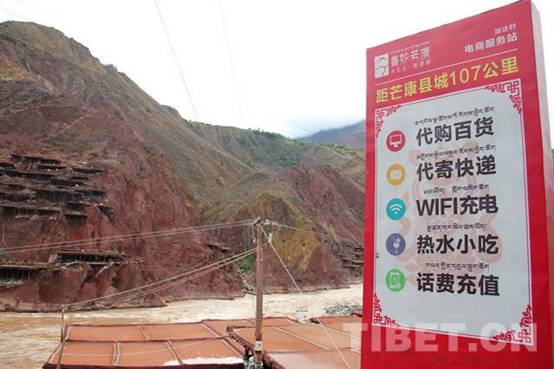 圖為千年古鹽田邊的芒康縣農(nóng)村電商服務(wù)站廣告牌。攝影:李元梅