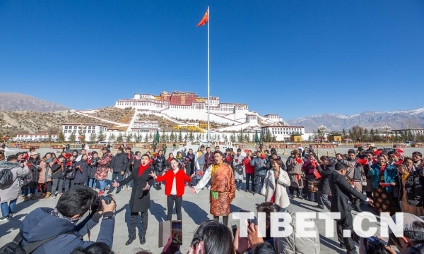 中國西藏網(wǎng)訊 2018年12月31日,年終歲末,西藏自治區(qū)拉薩市布達(dá)拉宮廣場上演了《我和我的祖國》快閃活動。來自西藏的高校青年學(xué)生和市民群眾向祖國深情告白,用快閃的方式慶祝新中國成立70周年。