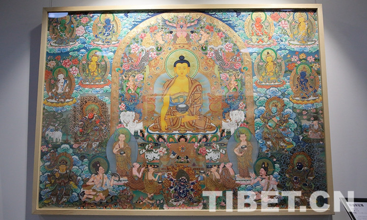 展覽共展出中國工藝美術(shù)大師、國家非物質(zhì)文化遺產(chǎn)項(xiàng)目代表性傳承人娘本、以及其弟子參與創(chuàng)作的唐卡作品25幅。圖為娘本唐卡作品《釋迦摩尼佛》。攝影:楊月云