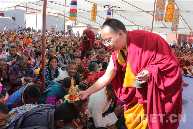 禮佛后,十一世班禪登上加查拉康正門前臨時(shí)寶座,接受托林寺僧人敬獻(xiàn)曼扎、切瑪?shù)龋S后,在寺廟高僧引領(lǐng)下,為長壽灌頂貢品加持,帶領(lǐng)眾僧共同誦經(jīng),祈愿莊嚴(yán)國土、國泰民安、普渡眾生,為1000余名僧俗信教群眾進(jìn)行長壽灌頂。
