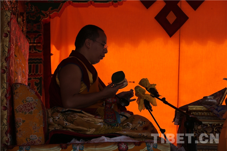 儀表莊重的十一世班禪以洪亮的聲音念誦灌頂經(jīng)文,教導(dǎo)僧俗信教群眾清凈自身,利樂眾生。緊接著,十一世班禪嫻熟地運(yùn)用各種法器開示密咒,在場僧眾雙手合十,凝神靜聽。