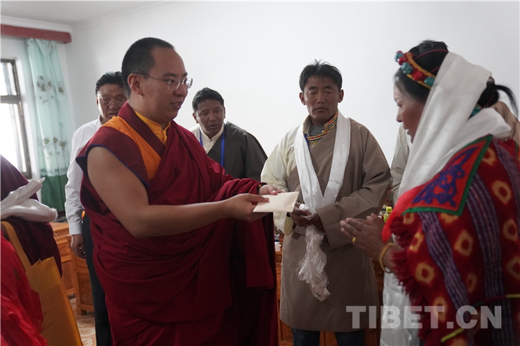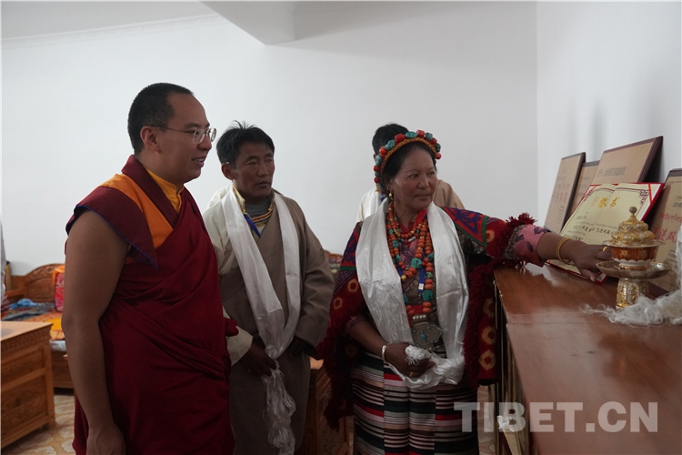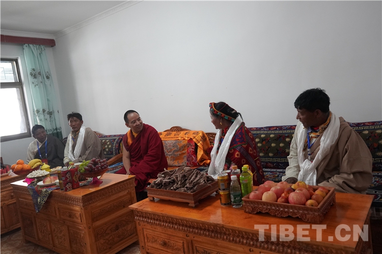 參觀朝拜活動結(jié)束后,十一世班禪還前往古格王朝遺址腳下的札布讓村走訪看望農(nóng)戶金珠德吉并送去了慰問金。金珠德吉一家在家門口迎接十一世班禪并敬獻(xiàn)哈達(dá),隨后迎請十一世班禪到客廳。十一世班禪與金珠德吉一家親切交談,詳細(xì)了解家庭生產(chǎn)生活情況。