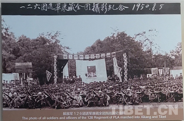 在中國共產(chǎn)黨和中央人民政府提出和平解放西藏的方針,中國人民解放軍第18軍迅速做好向西藏昌都地區(qū)進(jìn)發(fā)的各項戰(zhàn)斗準(zhǔn)備的同時,云南軍區(qū)第14軍126團(tuán)在沿途人民的援助下,于當(dāng)年7月進(jìn)抵云南德欽,作好了向西藏進(jìn)軍的準(zhǔn)備。圖為中國人民解放軍126團(tuán)進(jìn)軍康藏全團(tuán)指戰(zhàn)員紀(jì)念照