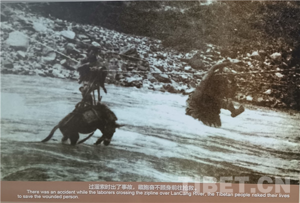 進(jìn)軍途中,因“大理至麗江段土工已完成百分之八十,但路基及橋梁,尚未建筑”,在運送物資時會使用當(dāng)?shù)亓锼鬟^江。圖為過溜索時出了事故,藏族群眾奮不顧身去搶救
