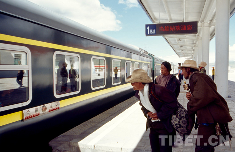 圖為藏族群眾欣喜地張望剛開通的列車駛進(jìn)車站 攝影:陳丹
