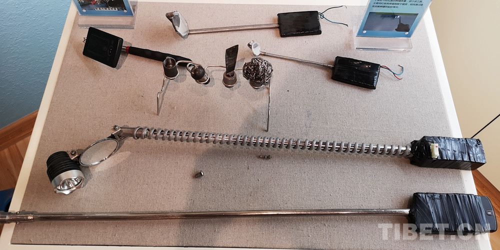 圖為楊永磊設(shè)計(jì)的管道內(nèi)熔渣挖取工具(圖上部三個(gè))、焊縫外觀檢查工具(圖下部?jī)蓚€(gè)),前者能以鏟、掃、粘或吸的方式將管道內(nèi)熔渣清理干凈,后者以燈照亮焊縫倒映于鏡面,便于觀察刁鉆位置焊縫的實(shí)際情況 攝影:李元梅