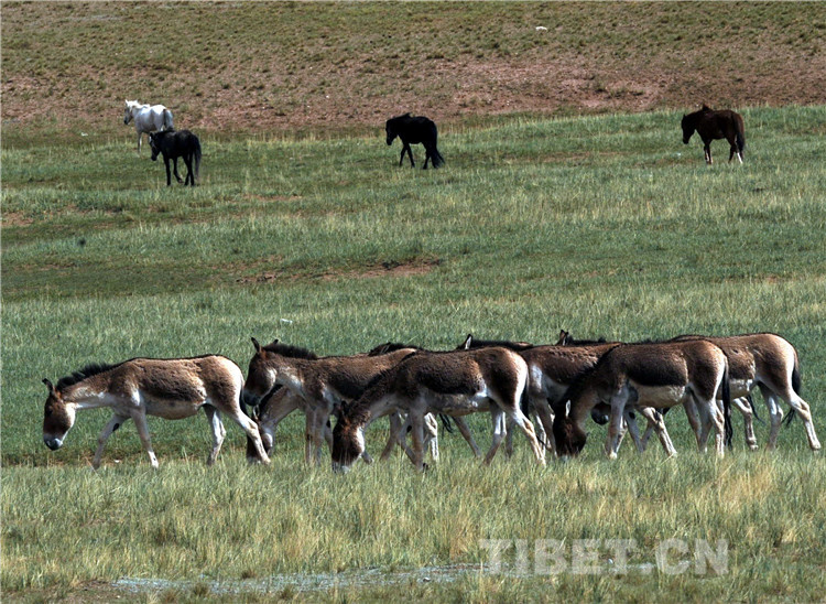 圖為生活在羌塘國家級自然保護(hù)區(qū)的國家一級保護(hù)動物藏野驢(前)在草原上與牧民放牧的馬匹(后)一同在草原上吃草。(唐召明2014年7月17日攝)