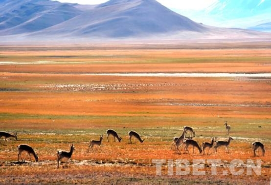 圖為生活在羌塘國家級自然保護區(qū)的國家二級保護動物藏原羚在草原上悠閑地吃草。(唐召明2016年10月7日攝)