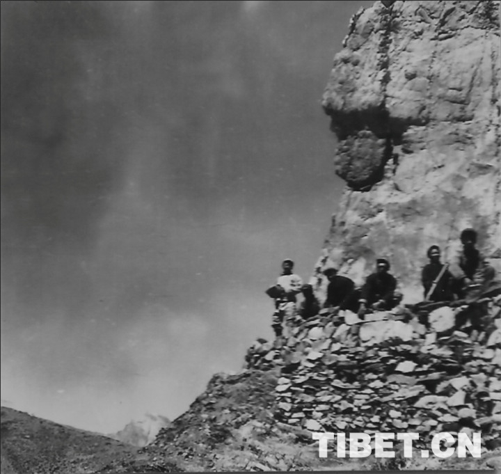 圖為懸空打炮眼。在峰巒險(xiǎn)峻的雀兒山開鑿石方,全靠人工用鋼針打眼、放炮。翻拍:李元梅