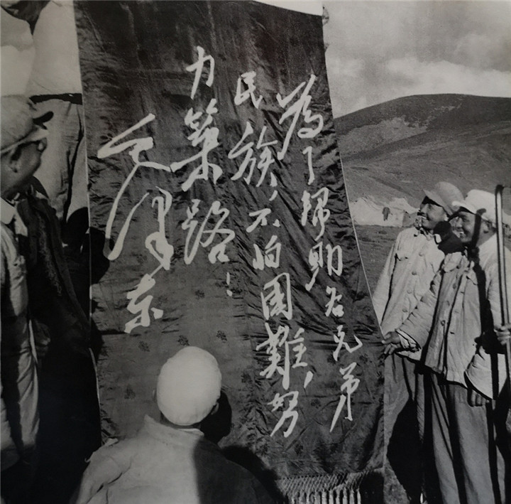 圖為毛主席的偉大號召——“為了幫助各民族兄弟,不怕困難,努力筑路!”鼓舞著指戰(zhàn)員們參加修筑公路的戰(zhàn)斗意志。翻拍:李元梅