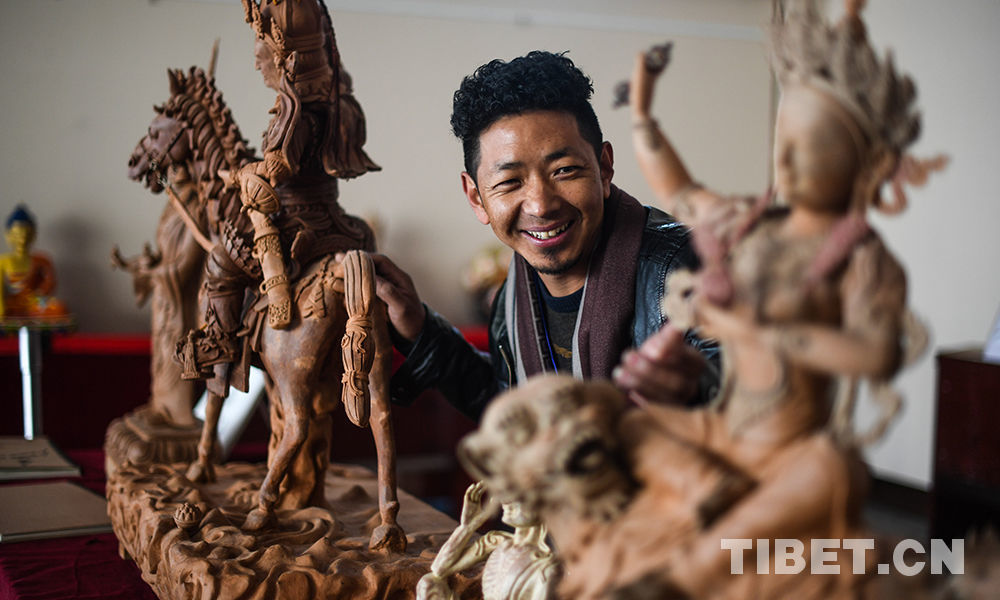 圖為拉薩市堆龍德慶區(qū)的達(dá)瓦桑珠展示他的泥塑作品 攝影:普布扎西
