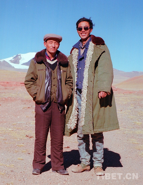 圖為唐召明(右)第二次獨闖藏北無人區(qū)時,與雙湖辦事處主任索朗公布在雙湖辦事處合影留念 (唐召明1988年攝)