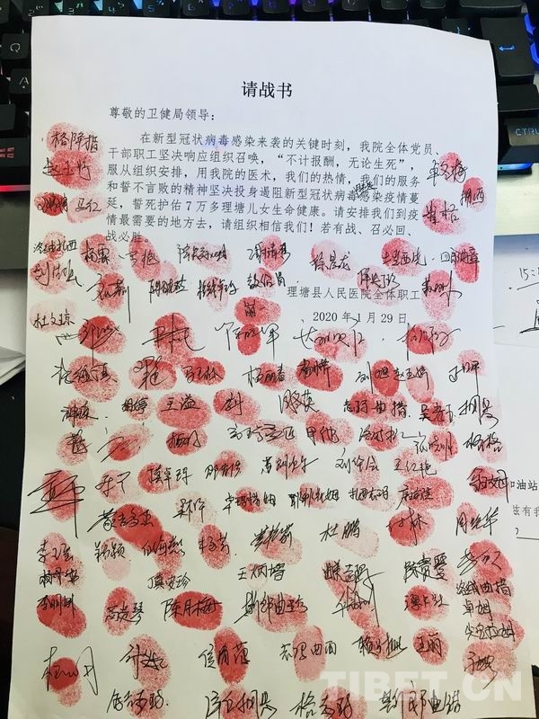 中國西藏網(wǎng)訊 “請安排我們到疫情最需要的地方去,請組織相信我們!若有戰(zhàn),召必回,戰(zhàn)必勝?!?月29日,理塘縣人民醫(yī)院100余醫(yī)護人員在一份集體請戰(zhàn)書上莊嚴簽名。